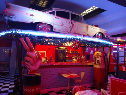 In Florence, Italy, Angelina and I found this 1950´s American Diner and had to have a cheese burger and curly fries accompanied by a strawberry shake. The staff were so friendly and posed for us graciously. The two women were Diedra and Bel and the men were; Mattia, Gabri and Fabio. The waitresses wore roller skates and we loved the food and the atmosphere. There are six of these diners in the Tuscany area, and we highly recommend them. The burgers and all were delicious! We need to send them a license plate from Colorado though.-Mona